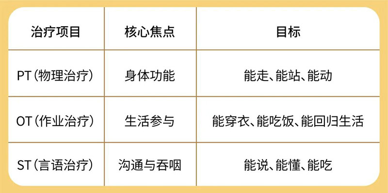 PT、OT、ST三者相辅相成,共同构成了一个完整的康复体系,分别从 “运动功能 - 生活自理 - 沟通吞咽” 三个核心维度切入,最终实现患者 “能走稳、能自理、能交流” 的综合康复目标,为回归家庭生活打下基础。