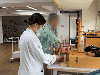 OT 团队聚焦其 “想自己吃饭、穿衣” 的需求,指导用健侧手辅助患侧手扣纽扣、使用带魔术贴的改良衣物,同时调整餐桌高度、提供防滑餐垫,让患者重新掌握自主进食能力;